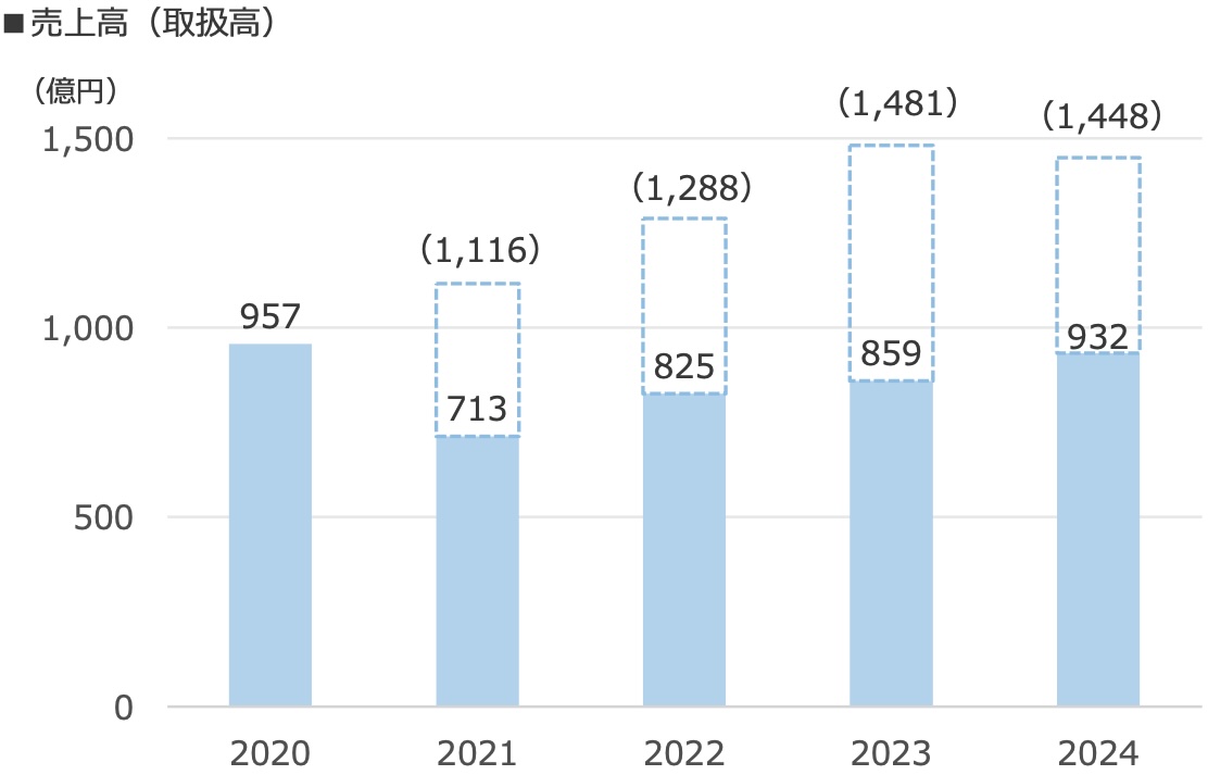 | 取扱高(※) | 1,448億円 (2025年3月期) (※)2022年3月期より適用を開始した「収益認識に関する会計基準」等による影響額を除いた旧基準に基づく売上高  |