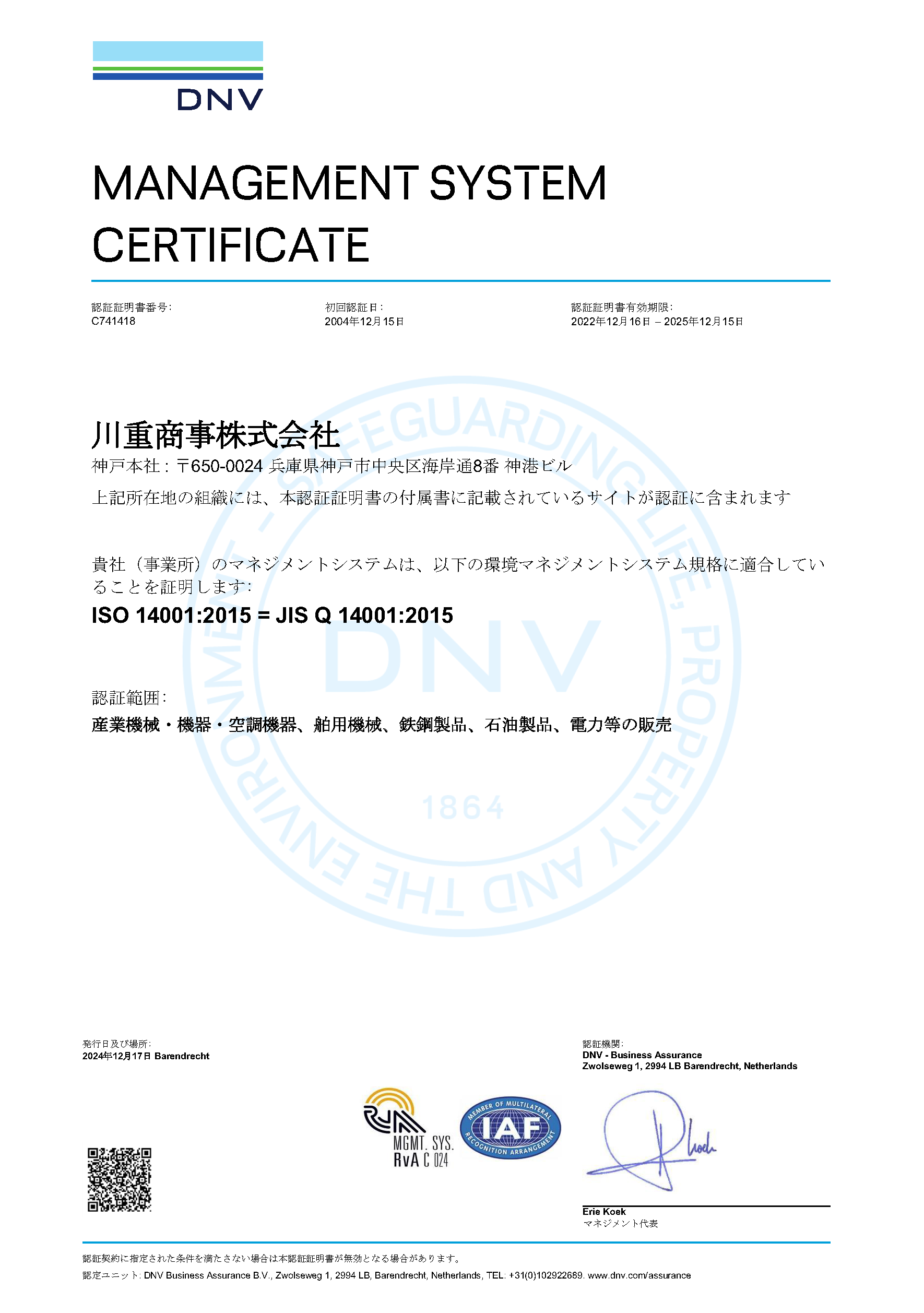 川重商事は環境に調和した健全な事業活動を通じて、人類共通の課題である地球環境問題の解決と「循環型経済社会」の実現を目指し、社会の「持続可能な発展」に貢献します。